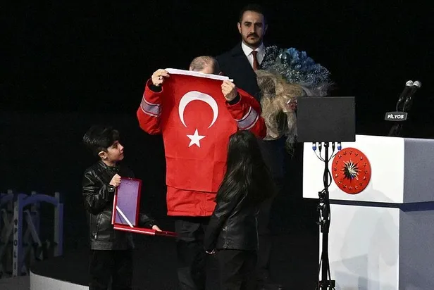 Konuşmasının ardından Cumhurbaşkanı Erdoğan'a, Enerji ve Tabii Kaynaklar Bakanı Fatih Dönmez günün anısına bir hediye takdim etti.