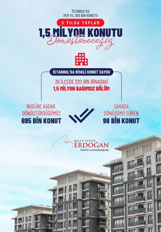 "Diğer yandan da ülke genelinde yeni bir seferberlik başlatıyoruz. Hiç şüphesiz 1999 depreminin acıları hala taze olan İstanbul, nüfus yoğunluğu ve stratejik önemi sebebiyle bu seferberlikte ilk sırada yer alıyor. İstanbul'un 39 ilçesinde 220 bin binadaki 1,5 milyon bağımsız bölüm risk altındadır. Bizim dönüşümünü tamamladığımız 695 bin konuta çok acil olarak her yıl 300 bin yeni konut ilave etmemiz gerekiyor. Halen sahada dönüşümü süren 98 bin konut var."