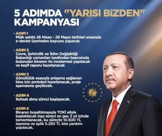 "İlk müjdemizin adı 'Kentsel Dönüşümde Yarısı Bizden' kampanyasıdır. Oturdukları evlerinin riskli yapı tespitini yaptıran vatandaşlarımızın ister yerinde, ister rezerv alanda dönüşüme giren evlerinin maliyetinin yarısını devlet olarak biz karşılayacağız. Mesela, diyelim ki 100 metrekare büyüklüğünde 2 oda, 1 salon evini yeniden yapmak isteyen vatandaşımızın önüne 1,5 milyon lira bir maliyet çıktı. Bunun 750 bin lirasını biz hibe olarak vereceğiz. Kalan 750 bin lirasını vatandaşımız kendisi koyacak ve böylece hemen evini yenileyebilecek. Devletin karşılayacağı kısım 120 metrekare büyüklüğündeki 3 oda, 1 salon ev için ise 1 milyon 800 bin liranın yarısına tekabül eden 900 bin liraya çıkacak."