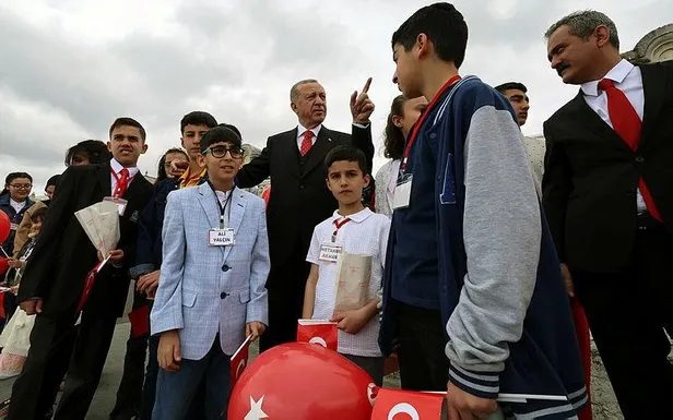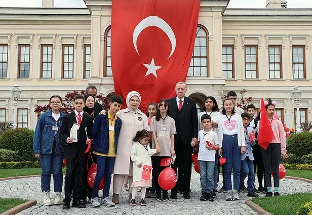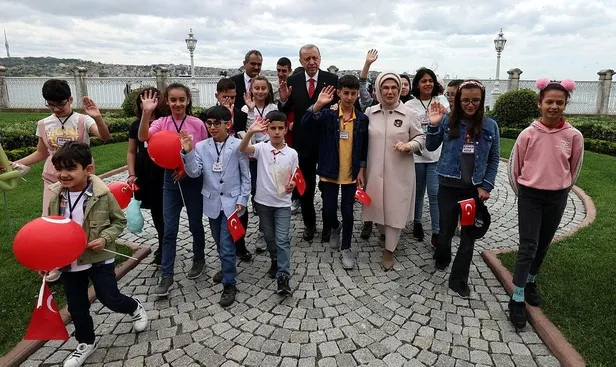 Başkan Erdoğan'a bu sırada eşi Emine Erdoğan, Milli Eğitim Bakanı Mahmut Özer ile 23 Nisan Ulusal Egemenlik ve Çocuk Bayramı münasebetiyle ziyarete gelen depremzede çocuklar da eşlik etti.