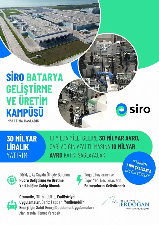 Otomotivin yanı sıra mikro mobilite endüstriyel uygulamalar, deniz taşıtları, yenilenebilir enerji için sabit enerji depolama uygulamaları ile geniş bir alanda hizmet verecek. Dünyaya gerçekleştireceği ihracat, yerli elektrikli araç üreticilerine yapacağı tedarik, geliştireceği fikri mülkiyet hakları ve nitelikli istihdam ile bu tesis ülkemize çok ciddi bir ekonomik değer kazandıracak. SIRO bu yatırımla 10 yılda milli gelire 30 milyar avronun cari açığın azaltılmasına, 10 milyar avronun üzerinde katkı sağlayacak, istihdama da 7 bin çalışanla destek verecektir. SIRO'nun ilk etapta hedeflediği 20 gigavatsaatlik kapasiteyi yeni fırsatlarla 50 gigavatsaatin üzerine çıkarmasını bekliyoruz.