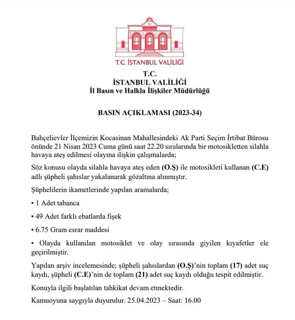 Valilikten yapılan açıklamada, Bahçelievler Kocasinan Mahallesi'ndeki AK Parti Seçim İrtibat Bürosu önünde 21 Nisan Cuma saat 22.20 sıralarında bir motosikletten silahla havaya ateş edilmesi olayına ilişkin çalışma yapıldığı belirtildi.
