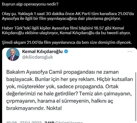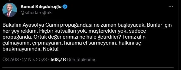 Etik dışı olarak AK Parti'nin Ayasofya ile ilgili reklam filmi yayınlayacağını öğrenen Kılıçdaroğlu, "Bakalım Ayasofya Camii propagandası ne zaman başlayacak. Bunlar için her şey reklam. Hiçbir kutsalları yok, müşterekler yok, sadece propaganda. Ortak değerlerimizi ne hale getirdiler? Temiz alın çalmayanın, çırpmayanın, harama el sürmeyenin, halkını aç bırakmayanındır. Nokta!" ifaderiyle kirli bir operasyona girişti.
