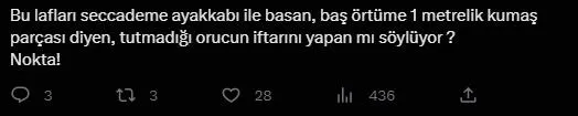 Kılıçdaroğlu'na tepki gösteren bir vatandaş, "Bu lafları seccademe ayakkabı ile basan, baş örtüme 1 metrelik kumaş parçası diyen, tutmadığı orucun iftarını yapan mı söylüyor? Nokta!" ifadelerini kullandı.