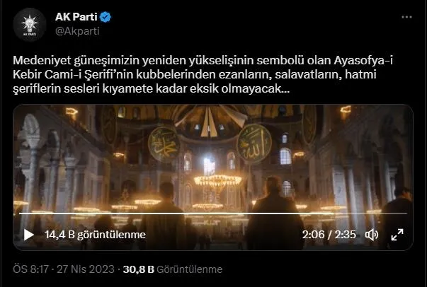 14 Mayıs seçimlerine kısa bir süre kala AK Parti resmi hesabı Ayasofya'nın 86 yıl sonra ibadete açılmasıyla ilgili sosyal medyadan bir paylaşım yaptı.