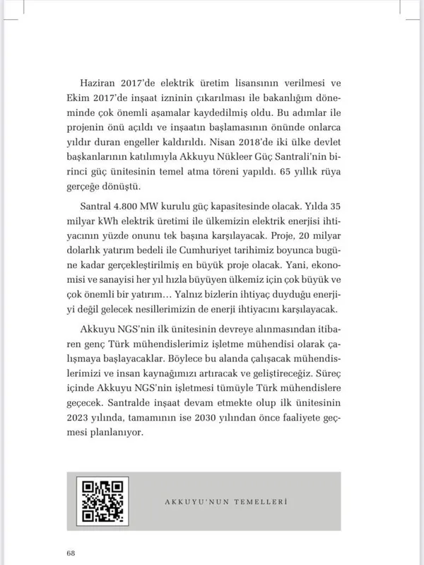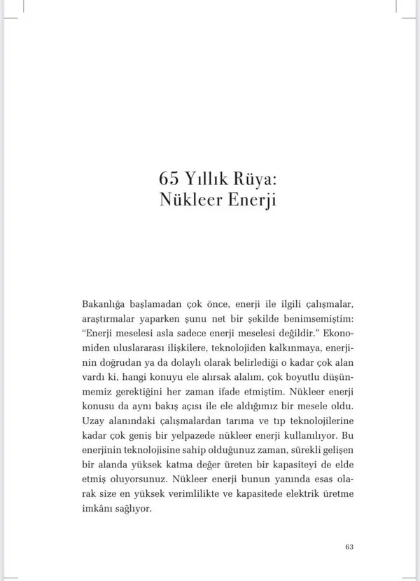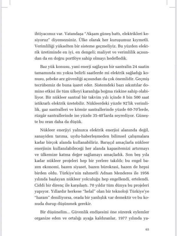 Berat Albayrak, "Burası Çok Önemli" kitabında "65 Yıllık Rüya: Nükleer Enerji" bölümünde şu ifadeleri kullanıyor:
