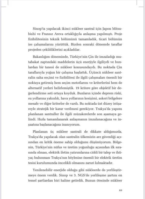Bakanlığım döneminde, Türkiye'nin Çin ile imzaladığı mutabakat zaptındaki maddelerin üçü enerjiyle ilgiliydi ve bunlardan bir tanesi de nükleer konusundaydı. Bu noktada Çin taraflarıyla yoğun bir çalışma başlattık. Üçüncü nükleer santralin saha seçimi ve fizibilitesi ile ilgili çalışmaları önemli bir noktaya getirmiş hem seçim metotlarını ve kriterlerini hem de alternatif yerleri belirlemiştik. 19 kritere göre objektif bir değerlendirme seti ortaya koyduk. Bunların içinde deprem riski, su yollarına yakınlık, hava yollarının kesişimi, askeri bölgelere mesafe ve diğer kriterler de vardı. Bu noktada üst düzey istişareyle stratejik bir karar verilmesi gerekiyor. Trakya'da yapımı planlanan santraller ile ilgili müzakerelerde son aşamaya gelindi. Hızla tamamlanarak anlaşmanın imzalanacağına ve inşaatına başlanacağına inanıyorum.