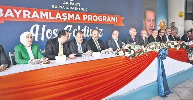 AK Parti İl Başkanı Davut Gürkan ve törende söz alan Bursa Milletvekili Hakan Çavuşoğlu, Sanayi ve Teknoloji Bakanı Mustafa Varank, AK Parti Genel Başkan Yardımcısı ve Bursa Milletvekili Efkan Ala ve Bursa Milletvekili adayı Ayhan Salman da konuşmalarında birlik ve beraberlik mesajları verdi. Konuşmaların ardından partililer sırayla protokolle bayramlaştı.