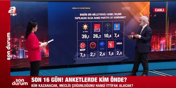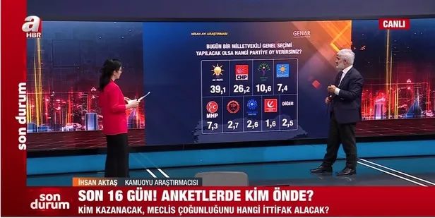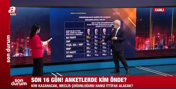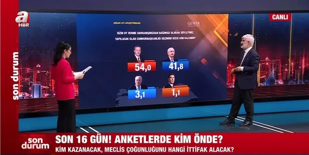 Genar Araştırma Şirketi'nin Nisan ayında 2023 Cumhurbaşkanlığı ve milletvekilleri seçimleri için gerçekleştirdiği son kamuoyu yoklamasını kamuoyu araştırmacısı İhsan Aktaş A Haber ekranlarında duyurdu.