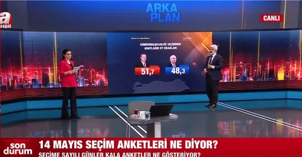 14 Mayıs seçimlerine sayılı gün kalmasıyla birlikte son anket oranları merak konusu oldu. A Haber’de Banu El moderatörlüğündeki Arka Plan’da 2023 Cumhurbaşkanlığı ve milletvekili seçimlerinde adayların son oy oranı GENAR Araştırma Şirketi Yönetim Kurulu Başkanı İhsan Aktaş açıkladı. Peki Seçime sayılı günler vatandaş ne diyor? İşte tüm detaylar...