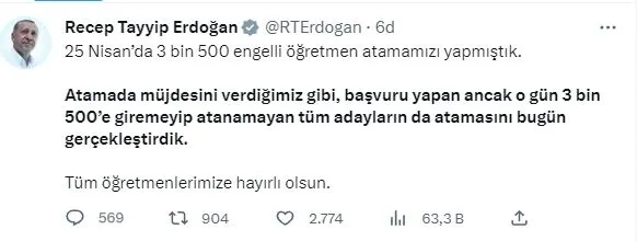 Başkan Recep Tayyip Erdoğan'ın katılımıyla 25 Nisan'da Milli Eğitim Bakanlığı (MEB) Şura Salonu'nda düzenlenen törenle 3 bin 500 engelli öğretmenin ataması gerçekleştirilmişti.