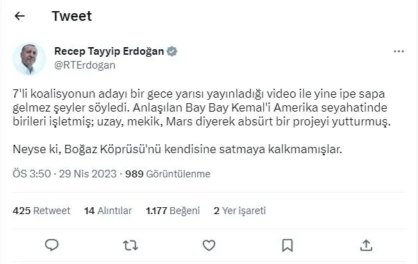 Yok eğer burada teknoloji geliştirme çalışmaları yapılacağını kastediyorsa, hamdolsun İstanbul'da ve ülkemizin dört bir yanında bunun için yüzlerce yer kurduk. Teknokentlerimizin her birinden dünya çapında başarılara imza eden girişimler, şirketler çıkıyor. Sayılarını 1249'a çıkardığımız araştırma geliştirme merkezlerimiz ile 316 tasarım merkezimiz de harıl harıl çalışıyor. Anlaşılan bay bay Kemal'i Amerika seyahatinde yine birileri işletmiş, kandırmış. Uzay, mekik, Mars diyerek absürt bir projeyi buna yurtturmuşlar. Neyse, en azından Boğaz Köprüsü'nü kendisine satmaya kalkmamışlar.