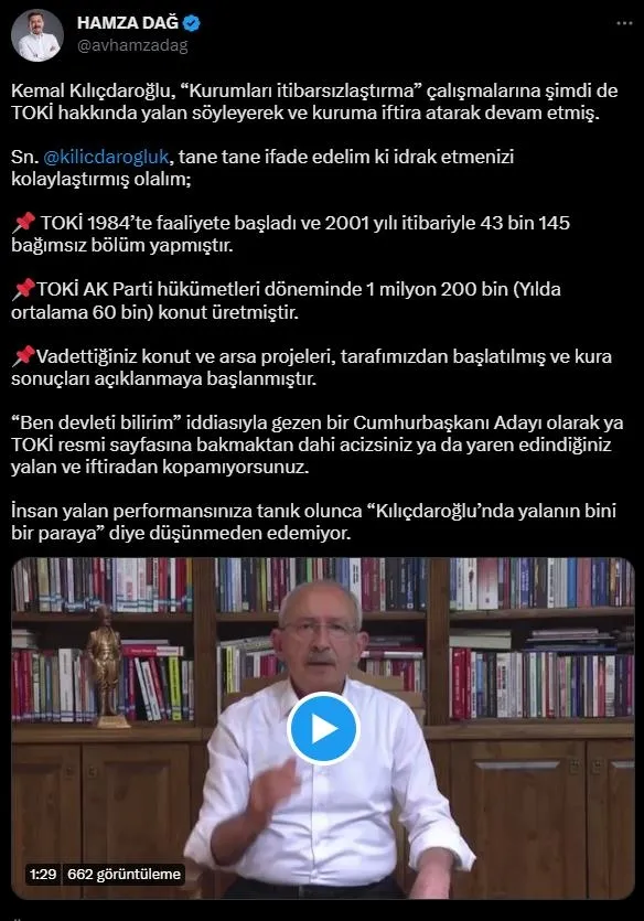 AK Parti Genel Başkan Yardımcısı Hamza Dağ, konuyla ilgili sosyal medya hesabından Kılıçdaroğlu'na tepki gösterdi. "Kemal Kılıçdaroğlu, "Kurumları itibarsızlaştırma" çalışmalarına şimdi de TOKİ hakkında yalan söyleyerek ve kuruma iftira atarak devam etmiş." diyen Dağ, "Sn. Kılıçdaroğlu, tane tane ifade edelim ki idrak etmenizi kolaylaştırmış olalım;
