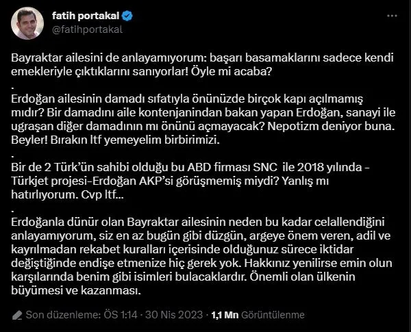 Alçak iftiralarla Bayraktar ailesini hedef alan Portakal, "Bayraktar ailesini de anlayamıyorum: başarı basamaklarını sadece kendi emekleriyle çıktıklarını sanıyorlar! Öyle mi acaba? Erdoğan ailesinin damadı sıfatıyla önünüzde birçok kapı açılmamış mıdır? Bir damadını aile kontenjanından bakan yapan Erdoğan, sanayi ile ugraşan diğer damadının mı önünü açmayacak? Nepotizm deniyor buna. Beyler! Bırakın ltf yemeyelim birbirimizi." ifadelerini kullandı.
