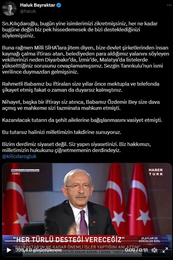 14 Mayıs seçimlerine kısa bir süre kala Turgay Ciner'in patronluğunu yaptığı Habertürk'e konuk olan Kılıçdaroğlu'na Bayraktar'ın "Sayın Kılıçdaroğlu'na bu soruluyor cevap yok. Bu iftirayı atan kişi de daha üst sıradan İzmir'de milletvekili adayı oluyor." şeklindeki açıklamaları soruldu.