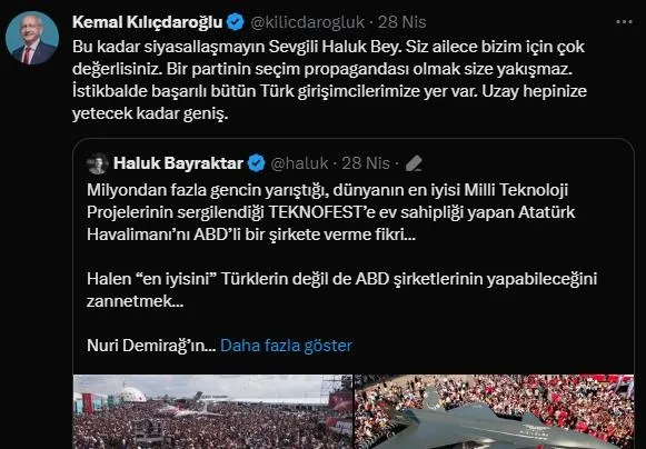 Tepkilere hedef saptırarak karşı koymaya çalışan ve BAYKAR'ı suçlamaya kalkan Kılıçdaroğlu sosyal medyadan yaptığı açıklamada, "Bu kadar siyasallaşmayın Sevgili Haluk Bey. Siz ailece bizim için çok değerlisiniz. Bir partinin seçim propagandası olmak size yakışmaz. İstikbalde başarılı bütün Türk girişimcilerimize yer var. Uzay hepinize yetecek kadar geniş." ifadelerini kullandı.