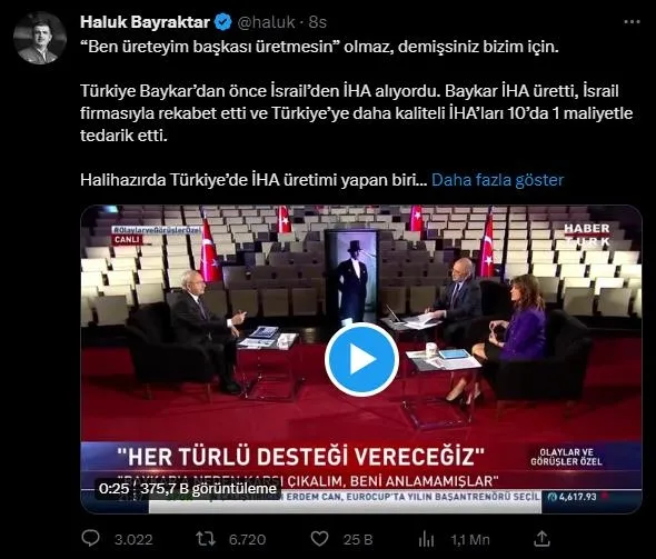 Bayraktar, üretim konusunda yeniden BAYKAR'ı hedef alan Kılıçdaroğlu'nun yalanlarını tek tek ifşa etti. BAYKAR'ın diğer firmaları rekabette geriden bıraktığını belirten Bayraktar, "Ben üreteyim başkası üretmesin" olmaz, demişsiniz bizim için. Türkiye Baykar'dan önce İsrail'den İHA alıyordu. Baykar İHA üretti, İsrail firmasıyla rekabet etti ve Türkiye'ye daha kaliteli İHA'ları 10'da 1 maliyetle tedarik etti. Halihazırda Türkiye'de İHA üretimi yapan biri vakıf şirketi, 7 firma var. Baykar, ABD, İsrail ve Çin firmalarını rekabette geride bıraktı, 30 ülkeye ihracat yaptı. Dünyanın en büyük İHA ihracatçısı oldu." dedi.