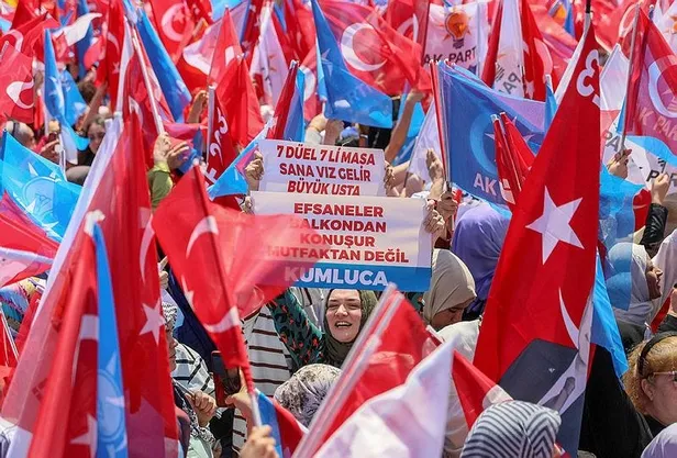 Türkiye'ye bugüne kadar yaptıkları yatırımlara ilişkin meydandaki ekranlardan izletilen video gösteriminin ardından Erdoğan, 14 Mayıs'ta aynı eser ve hizmet aşkı, hissiyat, azim ve kararlılıkla milletin huzuruna çıkacaklarını söyledi.