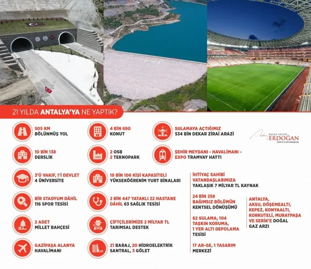 Erdoğan, "Antalya Havalimanımızın kapasitesini yıllık 80 milyona çıkartıyoruz. Ayrıca Konya-Antalya güzergahını 1 saat kısaltacak 5 bin 68 metrelik Demirkapı Tüneli ve 34 kilometrelik yolunu tamamladık hizmete açıyoruz." şeklinde konuştu.