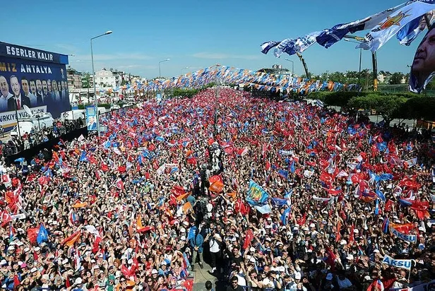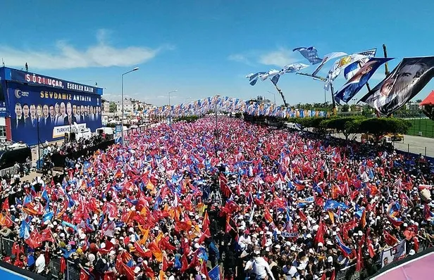 Seçimlere iki haftadan daha az vakit kaldığını belirten Erdoğan, alandakilere yönelttiği, "Antalya, 14 Mayıs'ta çocuklarımızın geleceğine sahip çıkıyor muyuz?", "21 yıllık kazanımlarımızı daha da ileriye taşıyor muyuz?", "Türkiye Yüzyılı'nın inşası için 'Bismillah' diyor muyuz?", "Türkiye Yüzyılı için doğru adımlarla yola devam ediyor muyuz?" sorularına "evet" yanıtını aldı.