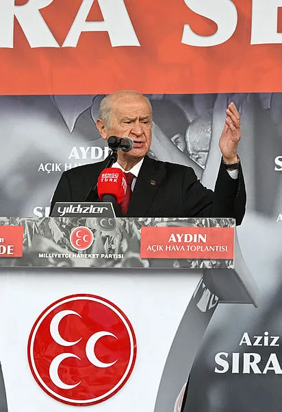 MHP Genel Başkanı Devlet Bahçeli, Atatürk Kent Meydanı'ndaki mitingde yaptığı konuşmada, Aydın'ın Milli Mücadele yıllarında olduğu gibi vatana sahip çıkmaya devam edeceğini söyledi.