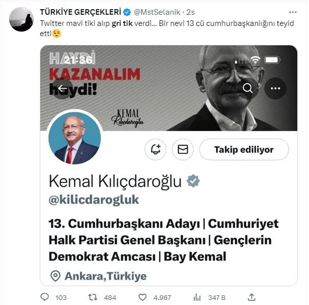 Bir paylaşımda, "Twitter, Cumhurbaşkanı Adayı Kemal Kılıçdaroğlu'na Devlet/Hükümet Yetkilileri'nde bulunan 'Gri Tik'i verdi. Devletin adamı, 85 milyonun Cumhurbaşkanı olacak. Geliyor gelmekte olan..." ifadelerinin kullanılması dikkatlerden kaçmadı.