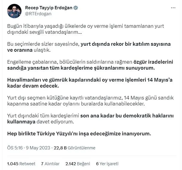 Bugün itibarıyla yaşadığı ülkelerde oy verme işlemi tamamlanan yurt dışındaki sevgili vatandaşlarım... Bu seçimlerde sizler sayesinde, yurt dışında rekor bir katılım sayısına ve oranına ulaştık. Engelleme çabalarına, bölücülerin saldırılarına rağmen özgür iradelerini sandığa yansıtan tüm kardeşlerime şükranlarımı sunuyorum. Havalimanları ve gümrük kapılarındaki oy verme işlemleri 14 Mayıs'a kadar devam edecek. Yurt dışı seçmen kütüğüne kayıtlı vatandaşlarımız, 14 Mayıs günü sandık kapanma saatine kadar oylarını buralarda kullanabilecekler. Yurt dışındaki tüm kardeşlerimi son ana kadar bu demokratik haklarını kullanmaya davet ediyorum. Hep birlikte Türkiye Yüzyılı'nı inşa edeceğimize inanıyorum.