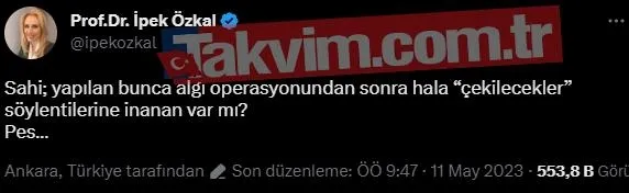 Memleket Partisi Genel Başkan Yardımcısı ve Parti Sözcüsü Prof. Dr. İpek Özkal, sosyal medya hesabı FETÖ'nün kurduğu kumpasa karşı CHP fondaşı medyanın başlattığı "çekil" operasyonuna tepki gösterdi. Özkal, "Sahi; yapılan bunca algı operasyonundan sonra hala "çekilecekler" söylentilerine inanan var mı? Pes…" ifadelerini kullandı.