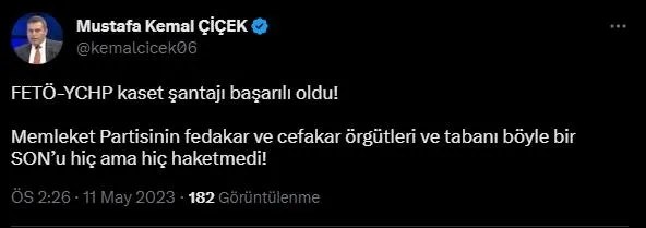 İnce'nin adaylıktan çekildiğini açıklamasına sosyal medya tepki yağarken, CHP Genel Başkanı Kemal Kılıçdaroğlu'nun eski avukatı Mustafa Kemal Çiçek, "FETÖ-YCHP kaset şantajı başarılı oldu! Memleket Partisinin fedakar ve cefakar örgütleri ve tabanı böyle bir sonu hiç ama hiç haketmedi!" dedi.
