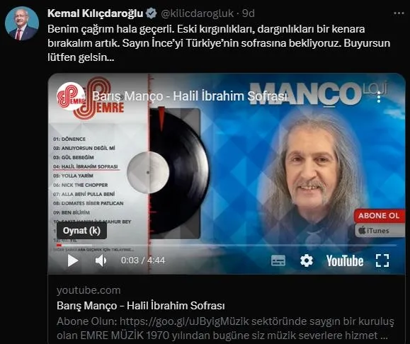 Kılıçdaroğlu, İnce'nin açıklamasının ardından sosyal medyadan adeta dalga geçer gibi bir paylaşımda bulundu. Kumpasın içinde yer alan Kılıçdaroğlu, "Benim çağrım hala geçerli. Eski kırgınlıkları, dargınlıkları bir kenara bırakalım artık. Sayın İnce'yi Türkiye'nin sofrasına bekliyoruz. Buyursun lütfen gelsin…" diyerek İnce'yi kumar masasına yeniden davet etti.