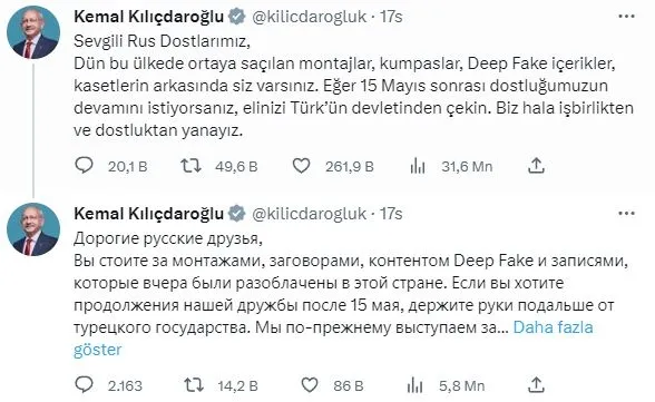 7'li koalisyonun Cumhurbaşkanı Adayı Kemal Kılıçdaroğlu, cumhurbaşkanlığı adaylığından çekilen Muharrem İnce hakkında dün yapılan paylaşımların arkasında Rusya olduğunu ileri sürerek sosyal medya hesabından "Sevgili Rus Dostlarımız, Dün bu ülkede ortaya saçılan montajlar, kumpaslar, Deep Fake içerikler, kasetlerin arkasında siz varsınız. Eğer 15 Mayıs sonrası dostluğumuzun devamını istiyorsanız, elinizi Türk'ün devletinden çekin. Biz hala işbirlikten ve dostluktan yanayız." açıklamasında bulundu.