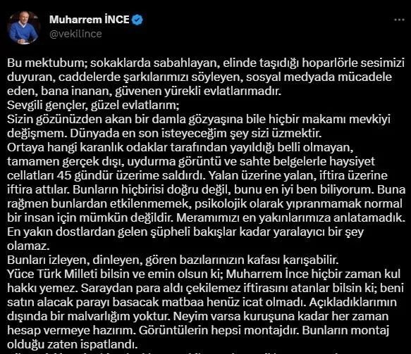 Yüce Türk Milleti bilsin ve emin olsun ki; Muharrem İnce hiçbir zaman kul hakkı yemez. Saraydan para aldı çekilemez iftirasını atanlar bilsin ki; beni satın alacak parayı basacak matbaa henüz icat olmadı. Açıkladıklarımın dışında bir malvarlığım yoktur. Neyim varsa kuruşuna kadar her zaman hesap vermeye hazırım. Görüntülerin hepsi montajdır. Bunların montaj olduğu zaten ispatlandı.