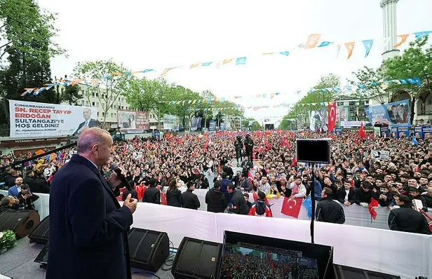 Partisince Sultangazi'deki Sultançiftliği Merkez Camisi'nin önünde düzenlenen mitingde halkı selamlayan Başkan Erdoğan, Cengiz Kurtoğlu'nun "Duyanlara Duymayanlara" şarkısına eşlik etti.