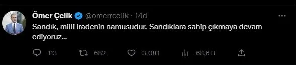 Sosyal medyadan açıklamalarda bulunan Çelik, "Sandık, milli iradenin namusudur. Sandıklara sahip çıkmaya devam ediyoruz…" ifadelerin kullandı.