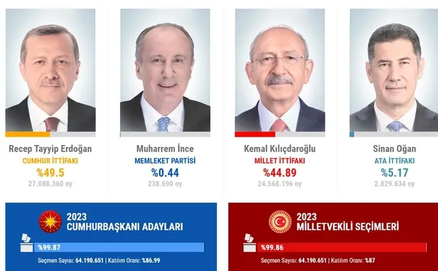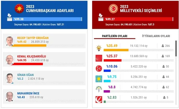 Kesin olmayan sonuçlara göre Sayın Recep Tayyip Erdoğan'ın yüzde 49,51, Sayın Kılıçdaroğlu'nun yüzde 44,88, Sayın Oğan'ın 5,47'nin oy aldığı görülmüştür. Saat 15.15 itibariyle 35 bin 874 oyun Sayın Recep Tayyip Erdoğan'a verilmiş olduğu kabul edildiğinde oylarının yüzde 49,54 olduğu görülmüş, Sayın Kılıçdaroğlu'na verilmiş olduğunda yüzde 44,89 kabul edilmiş olup, hiçbir adayın seçilme yeterliliğine ulaşamadığı görülmüştür.