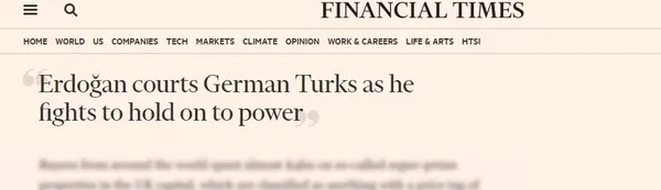 İngiliz Financial Times, yurt dışı oylarını manşetine tam olarak CHP ağzıyla taşıdı. Financial Times'ta yer alan haberde Avrupa'daki sandıklarda artış yaşanmasını "Erdoğan iktidarda kalmak için Almanya'daki Türklere kur yapıyor" iddasına dayandırdı.