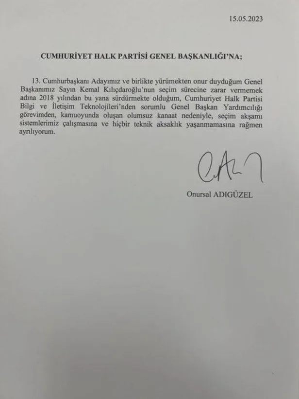 "13. cumhurbaşkanı adayımız ve birlikte yürümekten onur duyduğum Genel Başkanımız sayın Kemal Kılıçdaroğlu'nun seçim sürecine zarar vermemek adına 2018 yılından bu yana sürdürmekte olduğum, Cumhuriyet Halk Partisi bilgi ve iletişim teknolojilerinden sorumlu genel başkan yardımcılığı görevimden, kamuoyunda oluşan olumsuz kanaat nedeniyle, seçim akşamı sistemlerimiz çalışmasına ve hiçbir teknik aksaklık yaşanmamasına rağmen ayrılıyorum."