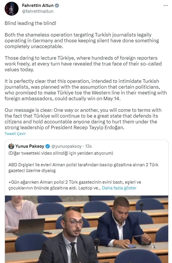 İletişim Başkanı Fahrettin Altun, "Bozacının şahidi şıracı. Almanya'da kanuni bir biçimde gazetecilik faaliyetlerinde bulunan Türk basın mensuplarını hedef alan çirkin operasyon kadar yapılanlara sessiz kalmak da kesinlikle kabul edilemez.