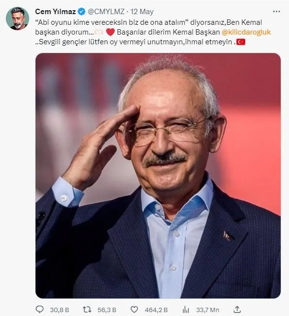 Cem Yılmaz seçime iki gün kala "Kemal Başkan'a oy verin" çağrısında bulunmuştu.