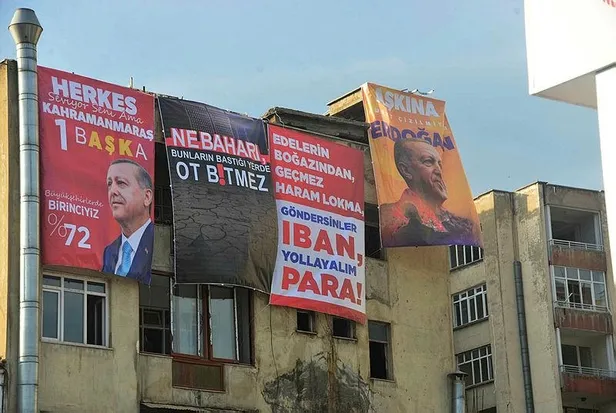 Öte yandan Başkan Erdoğan dün Kahramanmaraş'ta depremzedelerle bir araya gelmişti. Erdoğan'ın Trabzon Caddesi'nde yaptığı konuşma sırasında bir binaya asılan pankartlar dikkatlerden kaçmadı. CHP'lilerin nefretine tepki gösteren pankartlarda, "Edelerin boğazından, geçmez haram lokma, göndersinler IBAN, yollayalım para!" , "Ne baharı bunların bastığı yerde ot bitmez" ifadeleri yer aldı.