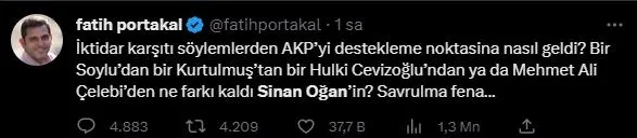 Portakal, "İktidar karşıtı söylemlerden AKP'yi destekleme noktasina nasıl geldi? Bir Soylu'dan bir Kurtulmuş'tan bir Hulki Cevizoğlu'ndan ya da Mehmet Ali Çelebi'den ne farkı kaldı Sinan Oğan'in? Savrulma fena…" diyerek AK Parti'ye geçen diğer isimleri hedef aldı.