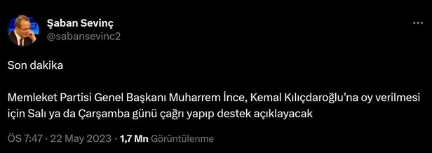 CHP yandaşı gazeteci Şaban Sevinç, Memleket Partisi Genel Başkanı Muharrem İnce'nin, cumhurbaşkanlığı seçimlerinin ikinci turunda Kemal Kılıçdaroğlu'na desteğini açıklayacağını iddia etmişti.
