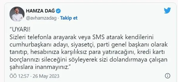 AK Partili Dağ, şu ifadeleri kullandı: "Sizleri telefonla arayarak veya SMS atarak kendilerini cumhurbaşkanı adayı, siyasetçi, parti genel başkanı olarak tanıtıp, hesabınıza karşılıksız para yatıracağını, kredi kartı borçlarınızı sileceğini söyleyerek sizi dolandırmaya çalışan şahıslara inanmayınız."