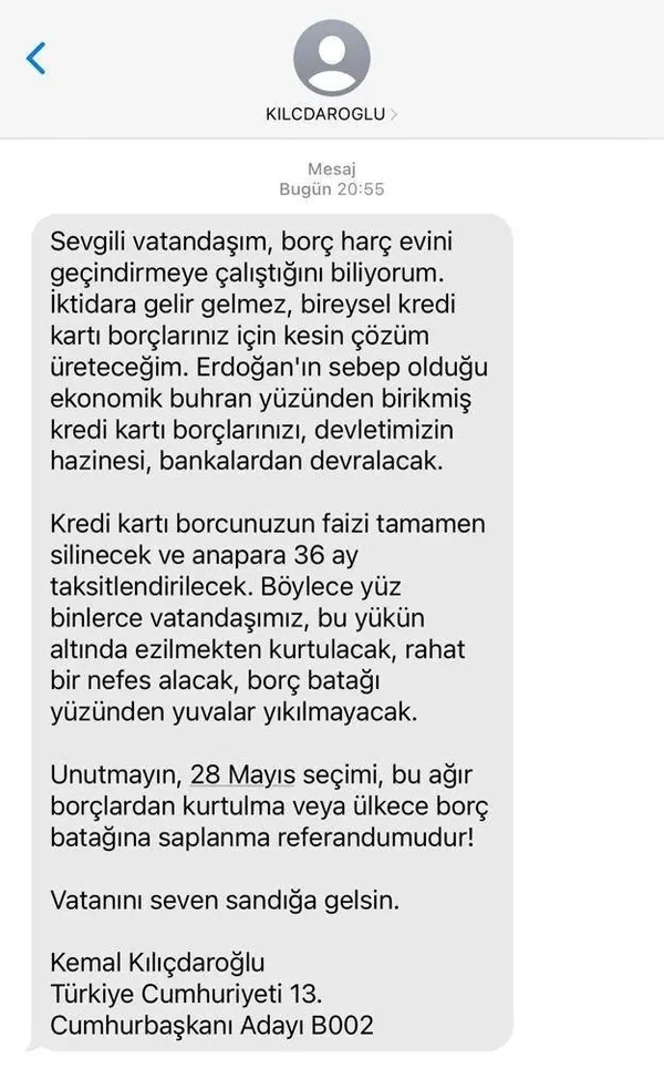 "Sevgili vatandaşım, borç harç evini güçlendirmeye çalıştığını biliyorum. İktidara gelir gelmez, bireysel kredi kartı borçlarınız için kesin çözüm üreteceğim. Erdoğan'ın sebep olduğu ekonomik buhran yüzünden birikmiş kredi kartı borçlarınızı, devletimizin hazinesi, bankalardan devralacak.