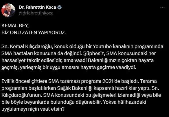 "Kemal Bey, biz onu zaten yapıyoruz" başlığıyla yaptığı paylaşımında Koca, "Sayın Kemal Kılıçdaroğlu, konuk olduğu bir Youtube kanalının programında SMA hastaları konusuna da değindi. Şüphesiz, SMA konusundaki her hassasiyet takdir edilesidir, ama vaadi, Bakanlığımızın çoktan hayata geçmiş, yerleşmiş bir uygulamasını hayata geçirme vaadiydi." değerlendirmesini yaptı.