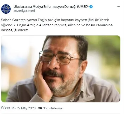 Uluslararası Medya Enformasyon Derneği (UMED), "Sabah Gazetesi yazarı Engin Ardıç'ın hayatını kaybettiğini üzülerek öğrendik. Engin Ardıç'a Allah'tan rahmet, ailesine ve basın camiasına başsağlığı dileriz." ifadeleriyle taziye mesajı paylaştı.