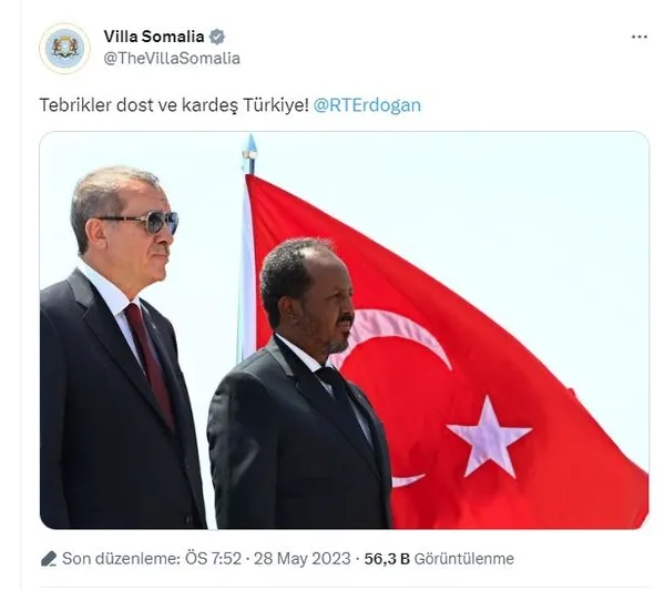 Somali Cumhurbaşkanlığı Ofisi de Türkçe mesaj paylaşarak Erdoğan'ı tebrik etti.