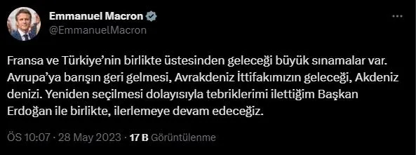 Fransa Cumhurbaşkanı Macron, sosyal medya hesabından Türkçe bir mesaj paylaştı. Macron, "Fransa ve Türkiye'nin birlikte üstesinden geleceği büyük sınamalar var. Avrupa'ya barışın geri gelmesi, Avrakdeniz İttifakımızın geleceği, Akdeniz denizi. Yeniden seçilmesi dolayısıyla tebriklerimi ilettiğim Başkan Erdoğan ile birlikte, ilerlemeye devam edeceğiz." ifadelerine yer verdi.
