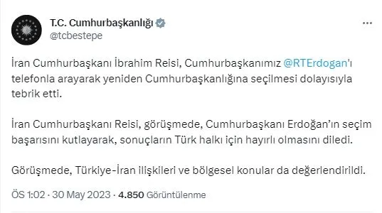 Seçim sonuçlarının "Türk halkının, Erdoğan'a olan güveninin sürdüğünün bir işareti olduğu" değerlendirmesinde bulunan Reisi, Türkiye ve İran'ın bu dönemde de tarihi, kültürel, dini ilişkilerin yanı sıra iyi komşuluk ilişkileri, karşılıklı saygı ve iki ulusun ortak çıkarlarına dayanan dostane ilişkilerinin her zamankinden daha fazla güçleneceğini belirtti.
