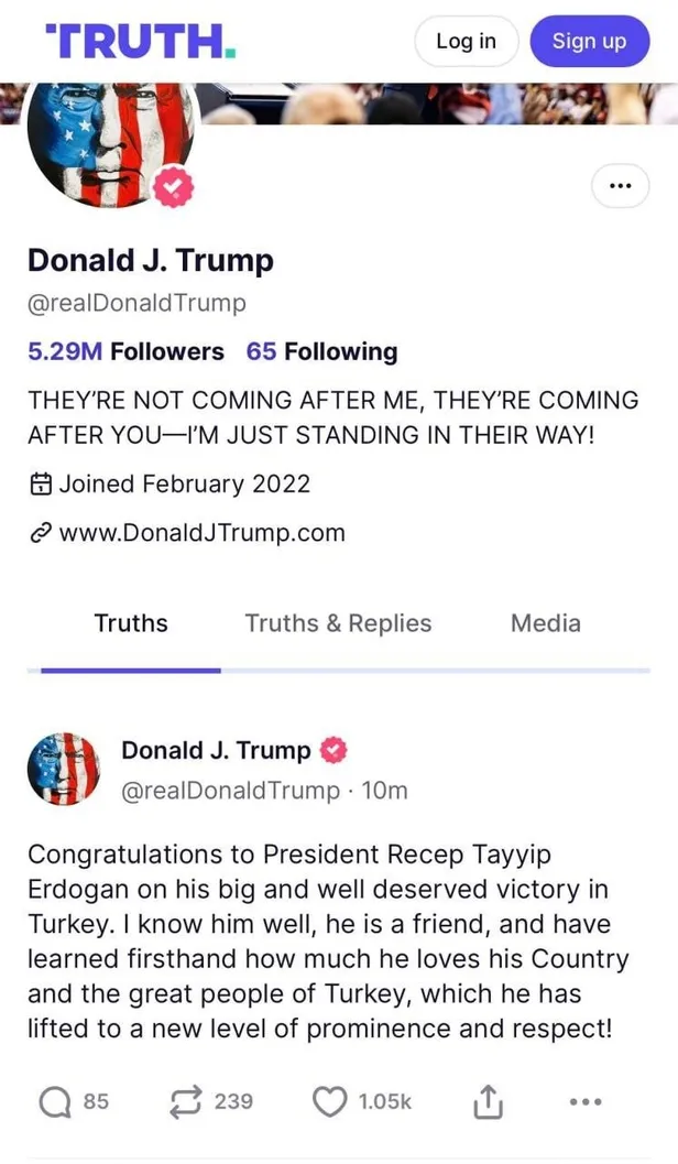 2024'te yapılacak başkanlık seçimlerine aday olan Trump, kendi sosyal medya sitesi TruthSocial'dan yaptığı paylaşımda, "Türkiye'deki büyük ve hak edilmiş zaferinden ötürü Başkan Recep Tayyip Erdoğan'ı kutluyorum." ifadesini kullandı.